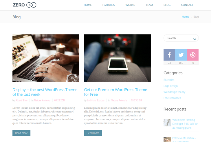 “Zero is a Multipurpose WordPress Theme with clean, minimalist, responsive design, 3 different representations of home page (One page, blog, business), beautiful transition effects and portfolio, sticky menu, font icons, scroll animation and much more.
