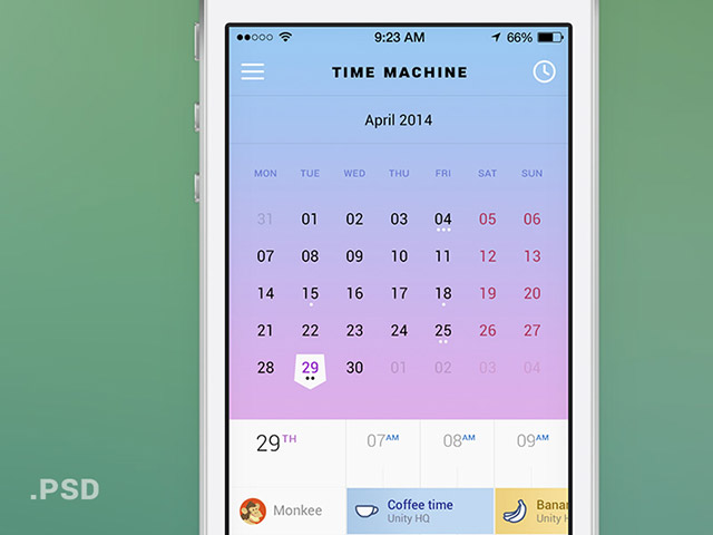 Time Machine is a mobile calendar UI designed with Photoshop vector shapes. Free PSD released by Unity.