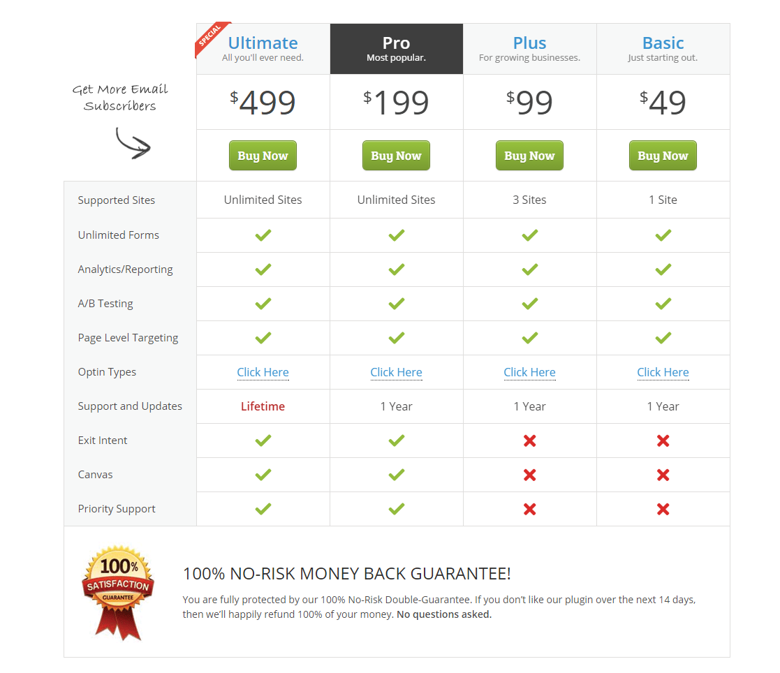 OptinMonster has four different pricing options that start at $49 up to $499. With the basic through the pro price options have many features but only has one year of support and updates. If you purchase the ultimate version you get lifetime support and updates along with even more features. You can see each price option and what features they come with from the print screen snippet I took from the OptinMonster Price page. Make sure to check this page because it might change in the future.