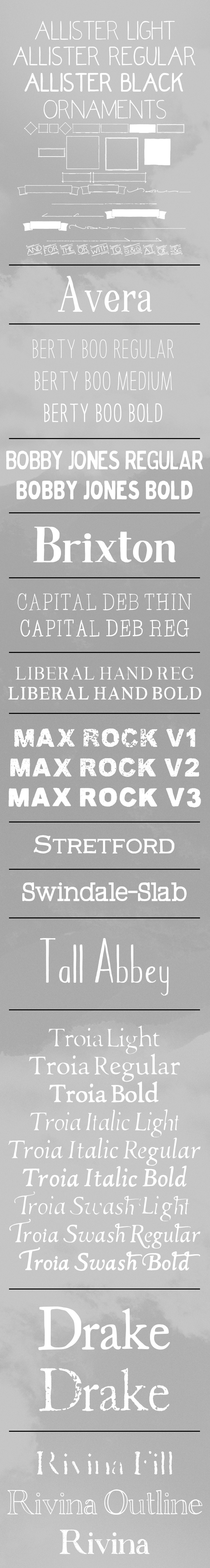 – Their entire collection of hand crafted fonts – 36 Individual fonts! All are in the Open type format making them perfect for graphic applications.